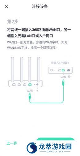 4、第2步将网线一端插入360路由器WAN口,另一端插入光猫LAN口或入户网口,WAN口一般为黄色,旁边有WAN字样,如为WAN/LAN字样,插哪一个都可以。