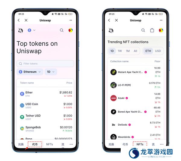 4、在Uniswap底部菜单中,还可以点击【代币】、【NFTs】、【流动池】等功能,可以查看一些实时的数据。