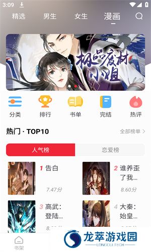 3、根据自身喜好选择小说或者漫画,还可以按照书籍分类,排行,榜单等来筛选自己想看的书籍内容。