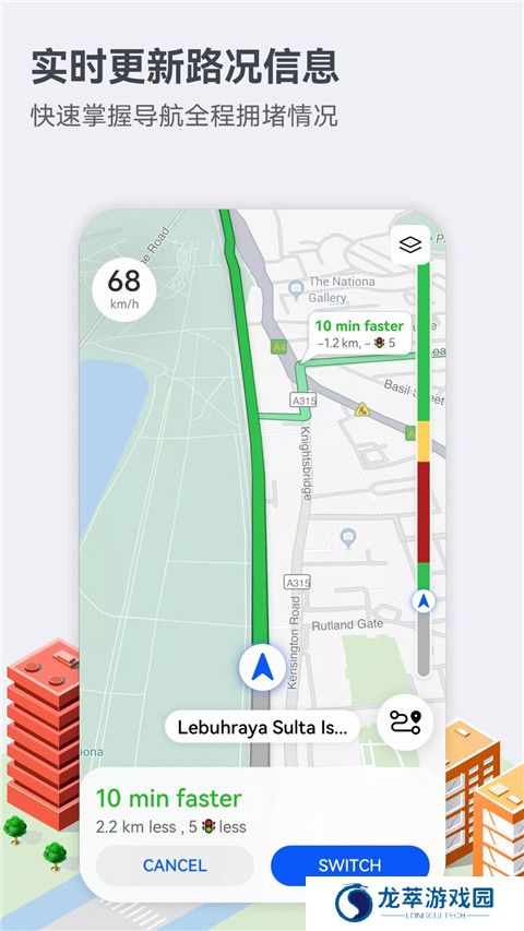 3、导航界面侧面显示路况彩虹条,使整个路况一目了然,更直观的了解导航路线。