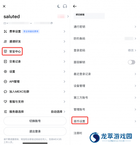 1、点击App左上角的【个人头像】,选择【安全中心】,滑动页面至最下方,选择【提币设置】。