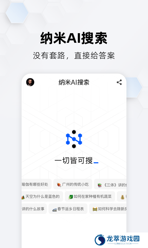 纳米搜索app是一款由360搜索引擎打造的AI搜索工具,在该平台中所打造的知识搜索功能,让用户们输入文字、语音等方式进行问问题,都可以精准的进行识别并为你快速的提供答案。该智能搜索引擎所具备的知识存储极为的全面,让用户们进行写作、翻译、规划、分析等等都是可以轻松完成的,基本做到了输入问题就能获取到相应的答案内容。