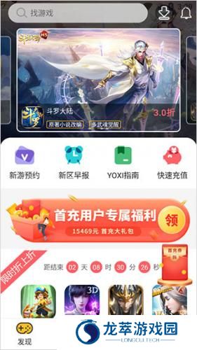 1、进入yoxi,用户可以在【发现】模块中查看新游预约、新区早报、YOXI指南和快速充值等功能。