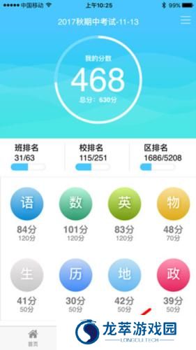 4、登录后,点击底部【学情】菜单,就可以查看到各科的成绩,示例如图。
