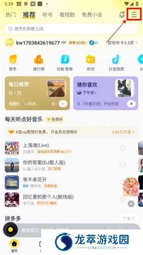 1、打开酷我音乐app,运行软件,在首页点击右上角的【菜单】。