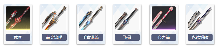 裁春(五星专武)>赫奕流明(长离专武)=千古洑流(常驻五星武器)>飞景(大月卡先约电台四星武器)=心之锚(1、4版本限时活动赠送四星武器)>永续坍缩(四星武器)