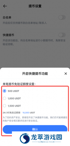 4、点击【快捷提币】右侧开启按钮,选择免验证的额度,点击【确认】,填写两步骤验证的验证码后,快捷提币功能开启。图片中显示设置了500USDT的免验证额度。