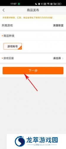 4、进入之后,选择所属游戏、商品种类、游戏区服,然后点击下一步即可。