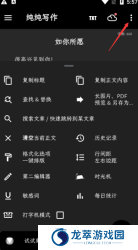 1、打开纯纯写作,点击右上角的三个点,然后找到设置下画板标签。