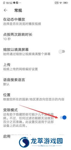 4、在最下方有一个“受限模式”大家点击一下就关闭了,蓝色就代表打开状态,灰色是关闭状态。