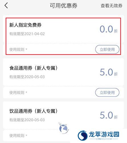 2、然后在我的-优惠卷-打开,查看新人指定免费卷,0.0折的,点击立即使用。
