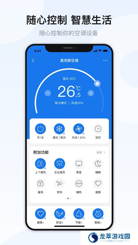 3、随时随地进行空调开机、关机、调温等操作,支持周定时控制,尽享智慧生活。