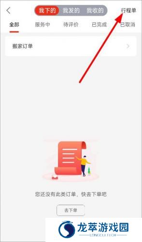 3、打开订单页面,可以看到我下的订单、我发的订单以及我收的订单,点击右上角行程单。