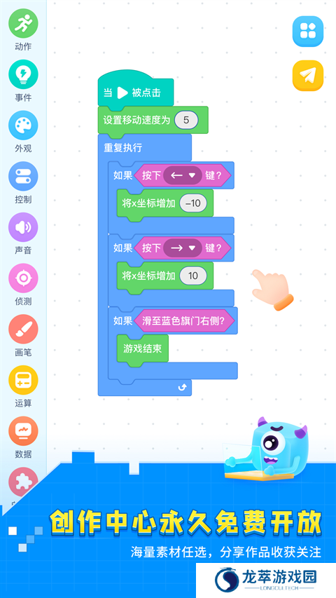 2、编程代码中心永久免费使用,创作环境对孩子很友好,素材丰富,都是可以直接使用。