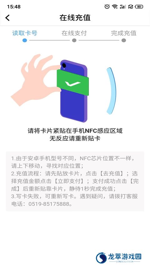 3、把交通卡实体卡紧贴于手机背面NFC感应区,选择充值金额付款;充值过程中请勿移动卡片。